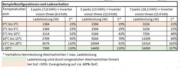 Auch das Ladeverhalten wird ab einer Temperatur <3°C und hier bei einem SoC der Batterie <50% auf den Wintermodus angepasst. Es setzt eine Zwangsladung auf ca. 60% ein. Dies erfolgt, wenn möglich, durch Solarstrom, ansonsten durch Netzstrom. Die Wintermodus ist beendet, wenn die Temperatur im Batteriemodul wieder auf Werte >= 5 °C steigt oder der SoC (z.B. weil die Sonne wieder scheint) weiter auf mehr Werte >60% steigt.