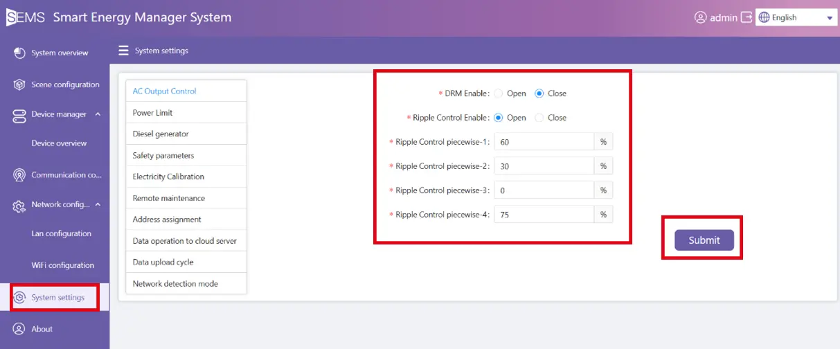 - Im Menüpunkt System settings die folgenden Einstellungen vornehmen und mit Submit bestätigen