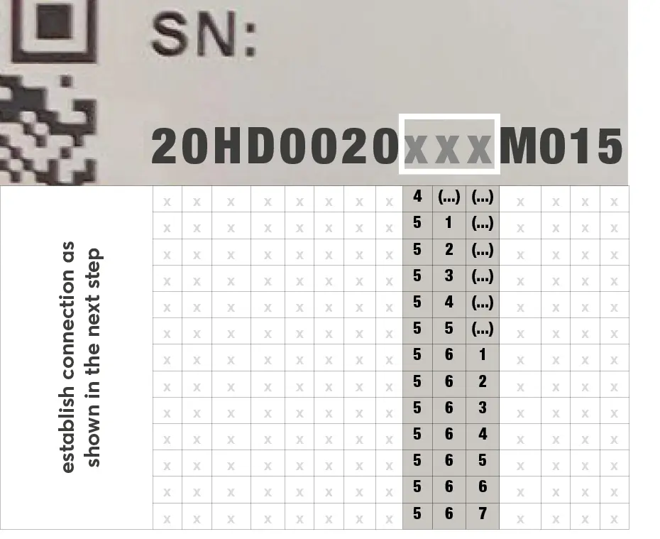 ACHTUNG: Der folgende Schritt ist nur notwendig, wenn die Seriennummer des letzten Inverters an der 9ten bis 11ten Stelle eine der in der Tabelle aufgelisteten Zeichenkombinationen aufweist. ‚(...)‘ kann dabei für Buchstaben und Ziffern stehen.