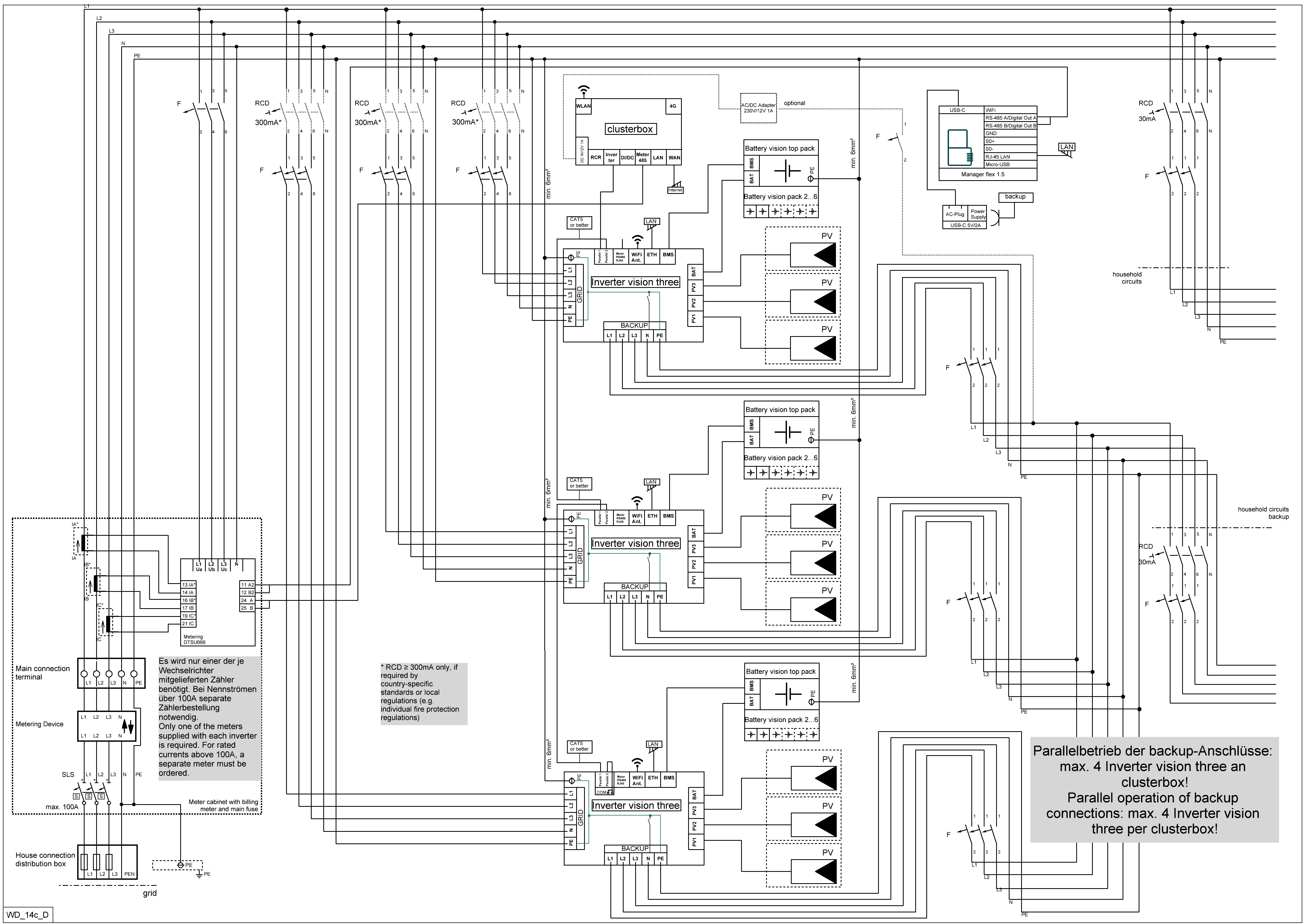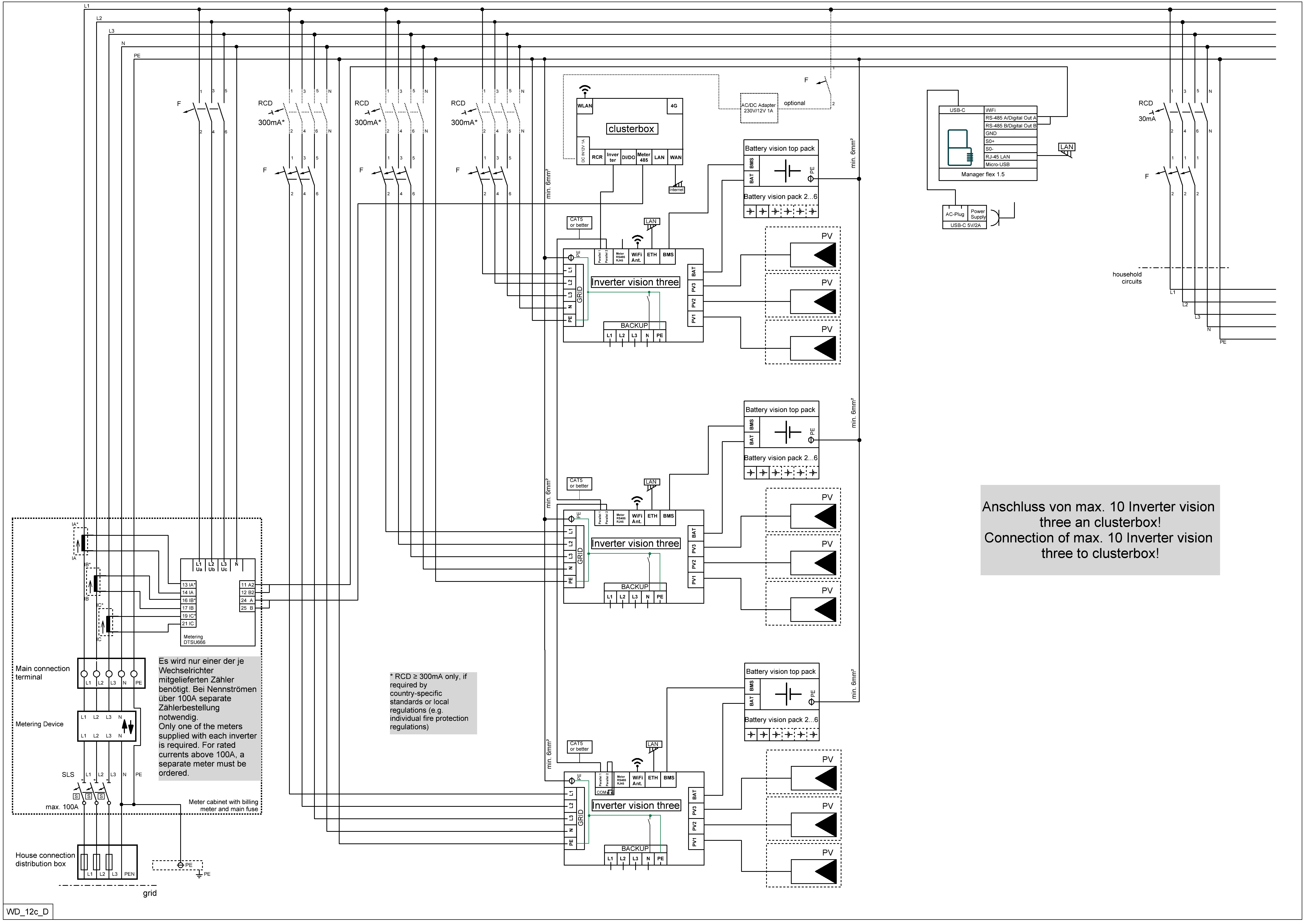 Die Seite beschreibt den Aufbau eines Energiesystems mit mehreren Inverter vision three Geräten. Die Battery vision clusterbox ermöglicht dabei den gemeinsamen Betrieb der Wechselrichter.