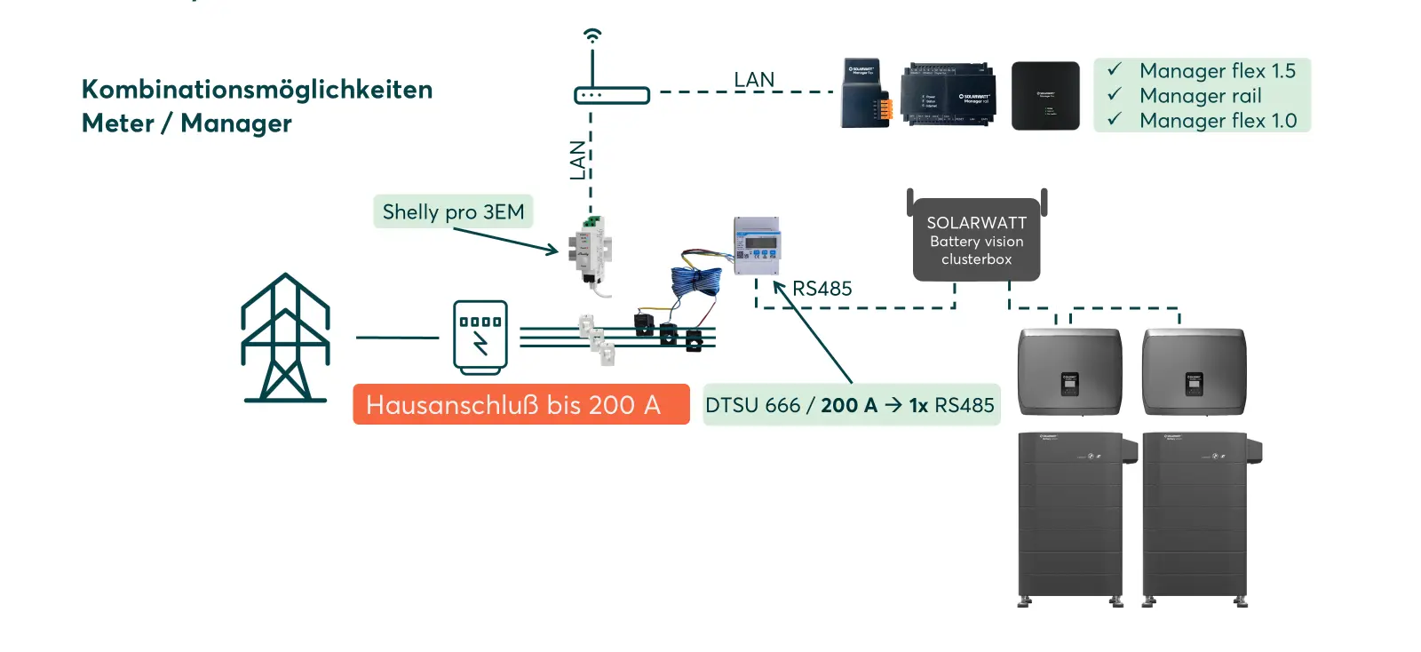 Abb. 2 Verbindung von Clusterbox und Manager via DTSU 666 RS485 CT 200A und Shelly Pro 3EM