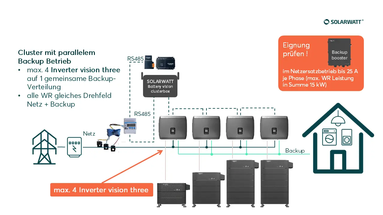 Es können maximal 4 Inverter vision three an die clusterbox angeschlossen werden, wenn die Notstromausgänge der Wechselrichter im Parallelbetrieb gekoppelt werden sollen.