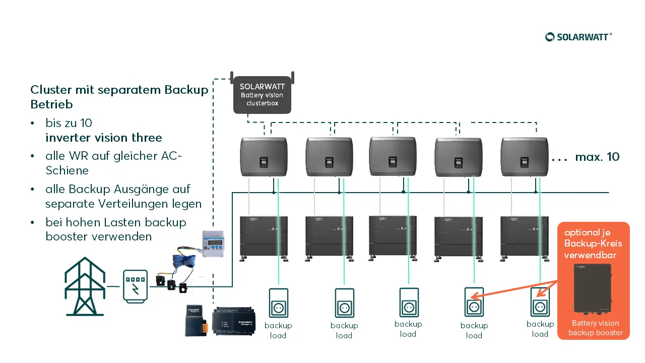 Es können maximal 10 Inverter vision three an die clusterbox angeschlossen werden, wenn keine Notstromlast angeschlossen ist oder die Notstromausgänge der Wechselrichter separat laufen und NICHT gekoppelt werden.