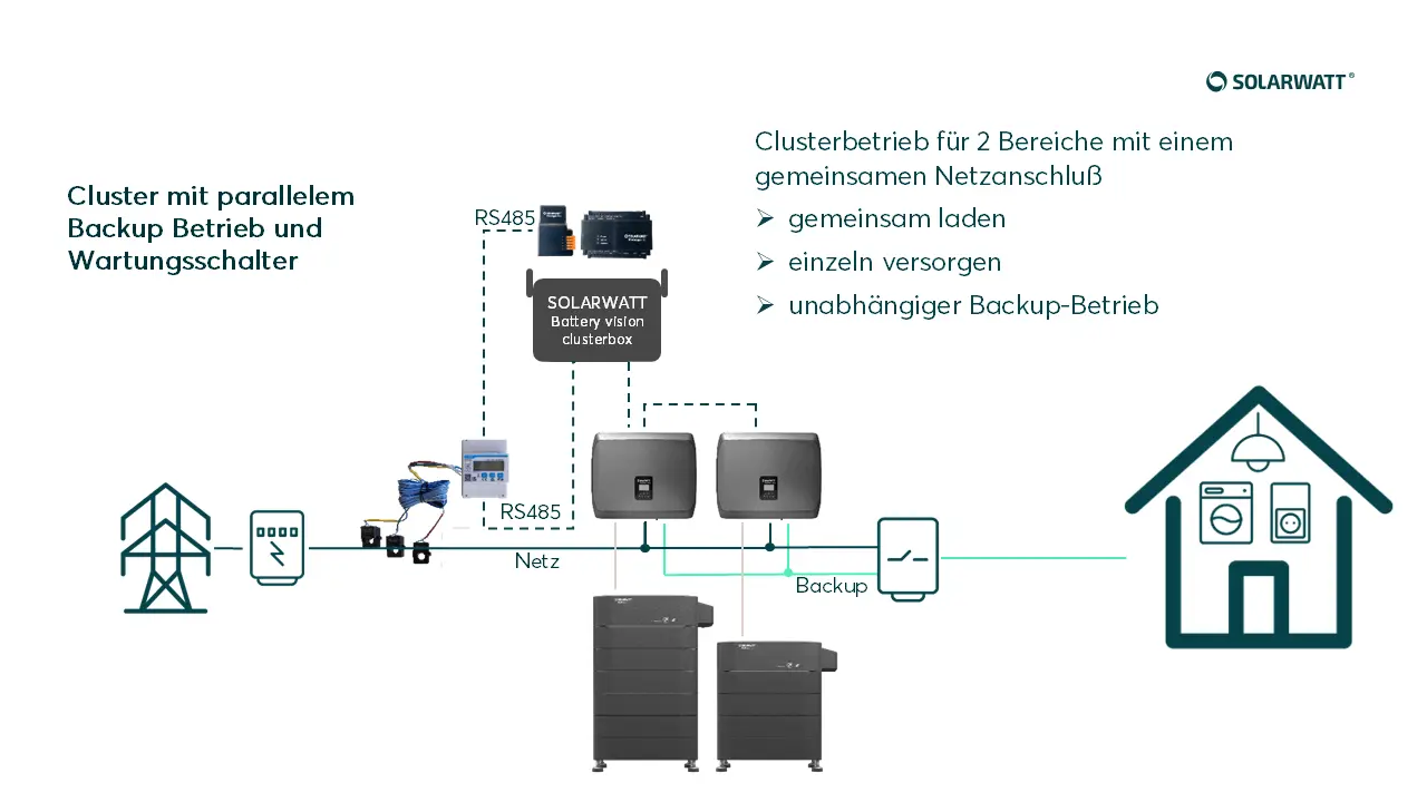 Die Seite beschreibt die Planung eines Clusters mit mehreren Battery vision Systemen und der Battery vision clusterbox.