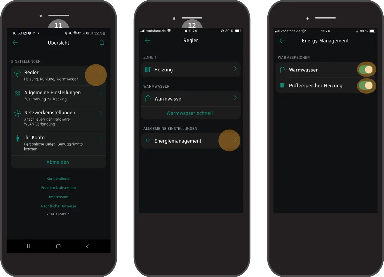 - Menüpunkt Energiemanagement wählen und sicherstellen, dass für die Optionen Heizung und Warmwasser alle Schieberegler aktiviert sind.