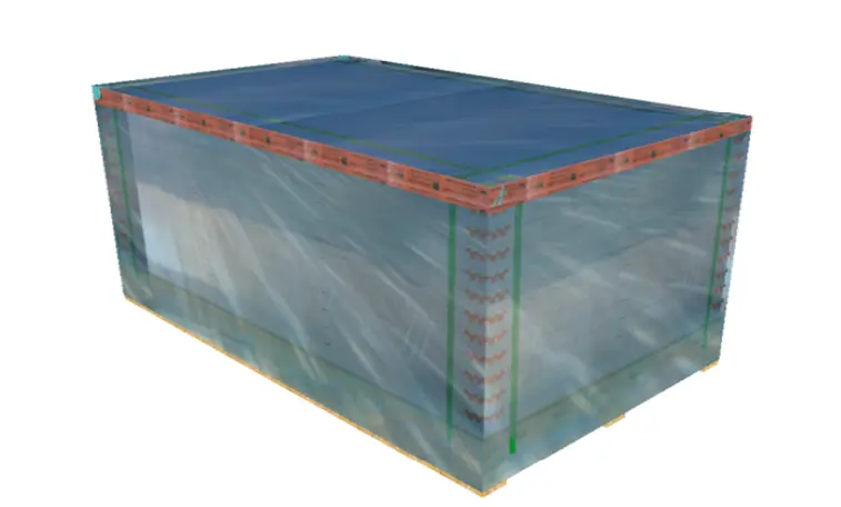 - 2 Spannbänder über die Längsseite und 2 Spannbänder über die Querseite senkrecht nach oben direkt neben den äußeren Klötzern der Palette anbringen.