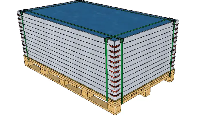 Verwenden Sie die Original Solarwatt-Paletten entsprechend dem Modultyp. Diese garantieren eine ausreichende Stabilität und Größe, um das Gewicht des Modulstapels aufzunehmen und um Beschädigungen an den Modulen zu verhindern!