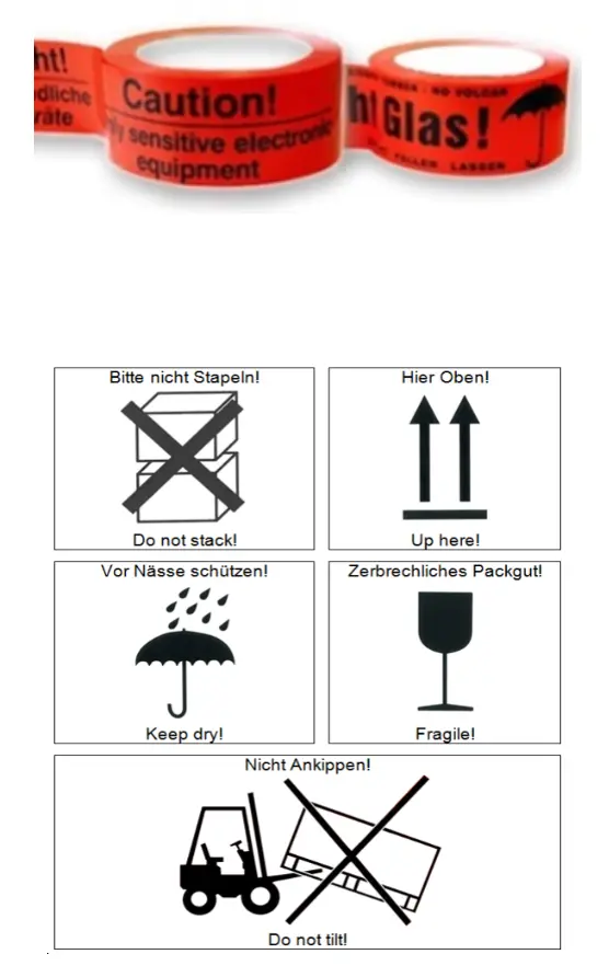 Die Kennzeichnung kann auf dem verwendeten Packband gedruckt sein oder auf mindestens 2 Seiten des Packstückes in Form von deutlich sichtbaren Piktogrammen erfolgen. Drucken sie sich dazu das Piktogrammblatt LINK!) 2x aus.